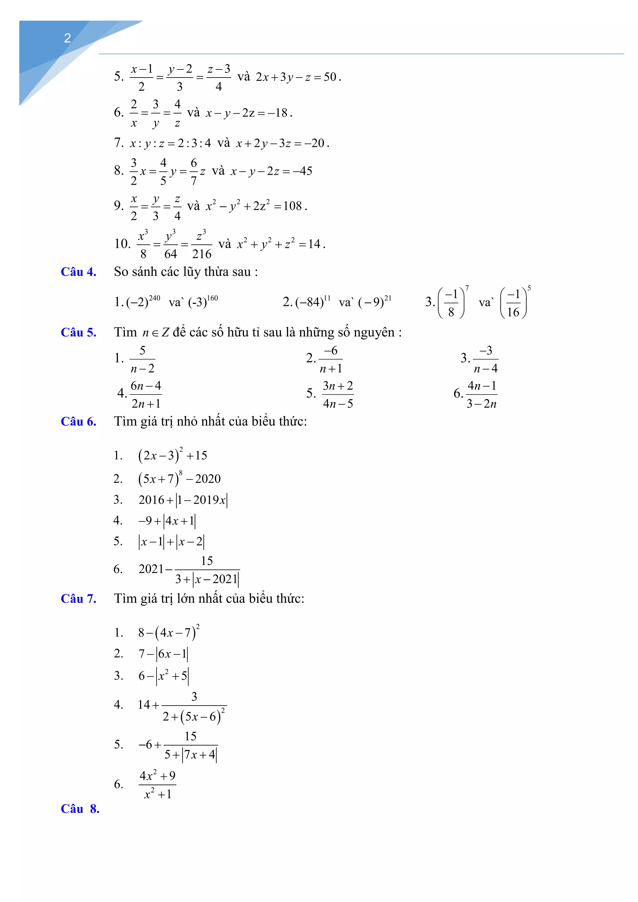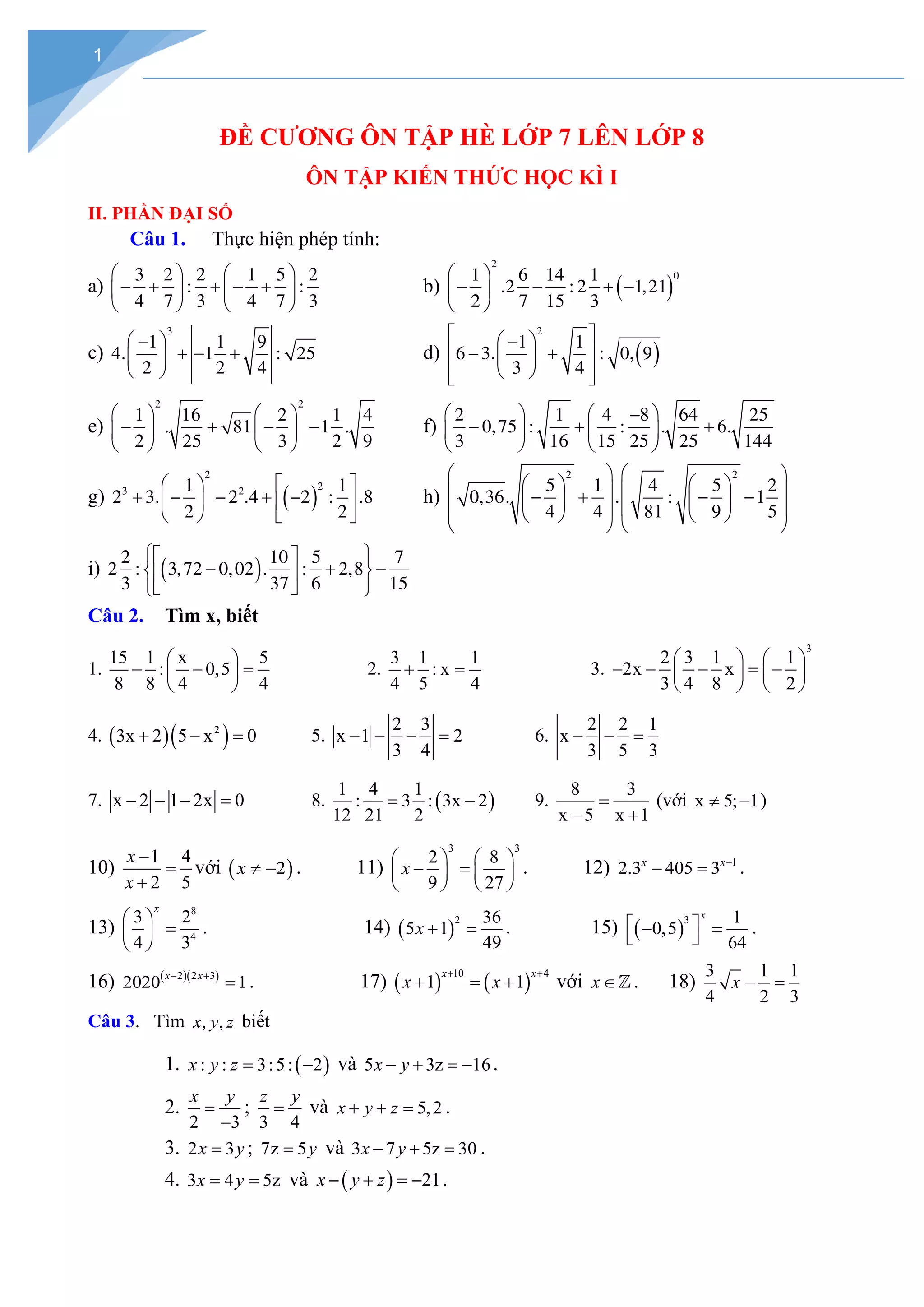 Tài liệu ôn tập cho học sinh lớp 7 lên lớp 8 bao gồm các phần đại số và hình học, với nhiều bài tập thực hiện phép tính, tìm x, tìm giá trị lớn nhất và nhỏ nhất của biểu thức. Nó cũng bao gồm so sánh các lũy thừa, tìm số nguyên và giải quyết các vấn đề tỉ lệ và tổng. Các bài tập phong phú giúp củng cố kiến thức cho học sinh trước khi lên lớp mới.