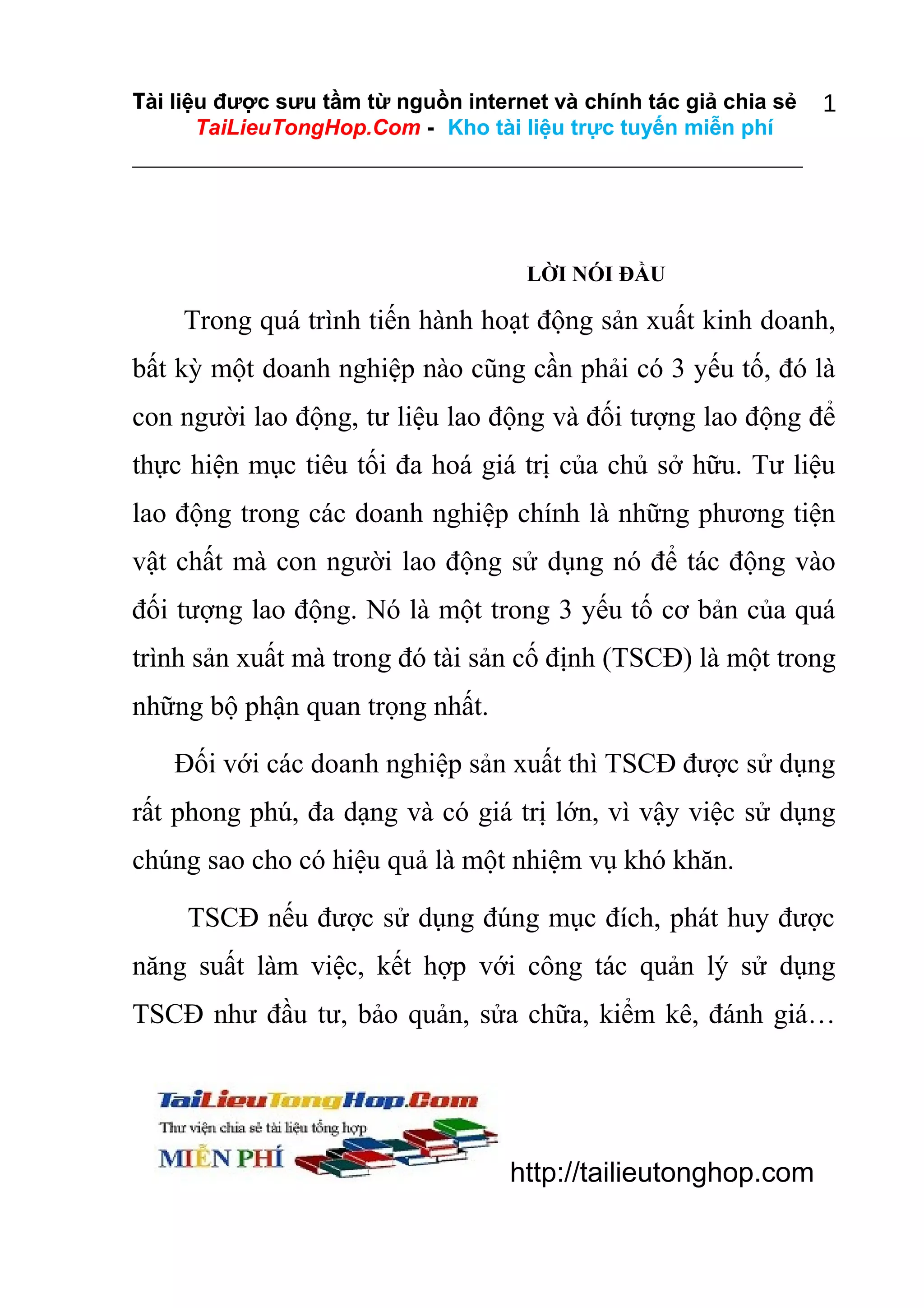 Tài liệu này đề cập đến vai trò của tài sản cố định (tscđ) trong hoạt động sản xuất kinh doanh của doanh nghiệp, nhấn mạnh tầm quan trọng của việc quản lý và sử dụng hiệu quả tscđ để tối đa hóa lợi nhuận. Nó cũng nêu ra thực trạng và giải pháp nâng cao hiệu quả sử dụng tscđ tại Công ty Cao Su Sao Vàng Hà Nội, đồng thời trình bày nội dung tài liệu chia thành ba chương chính. Qua nghiên cứu, tác giả nhận thấy việc quản lý tscđ có ý nghĩa lớn trong cả lý luận và thực tiễn.