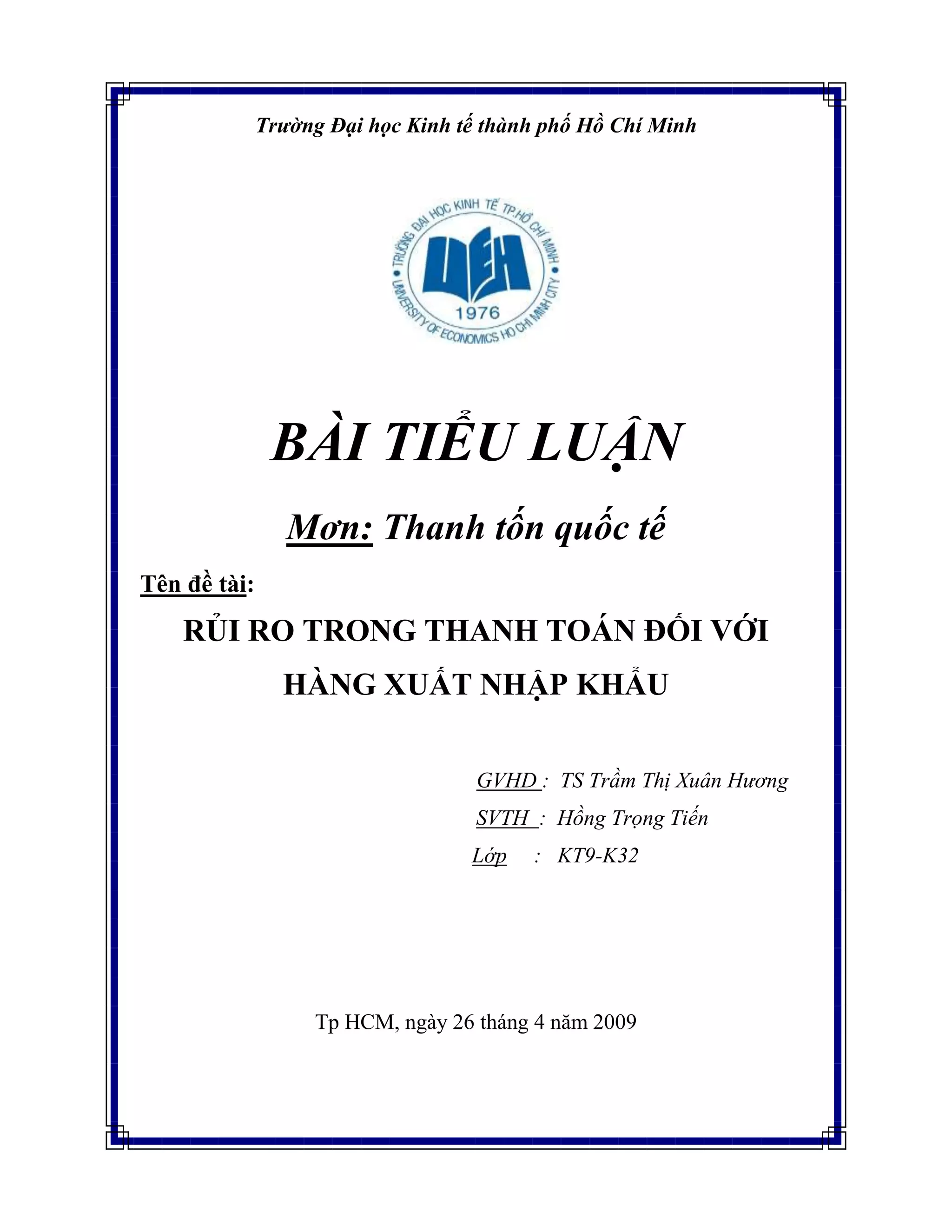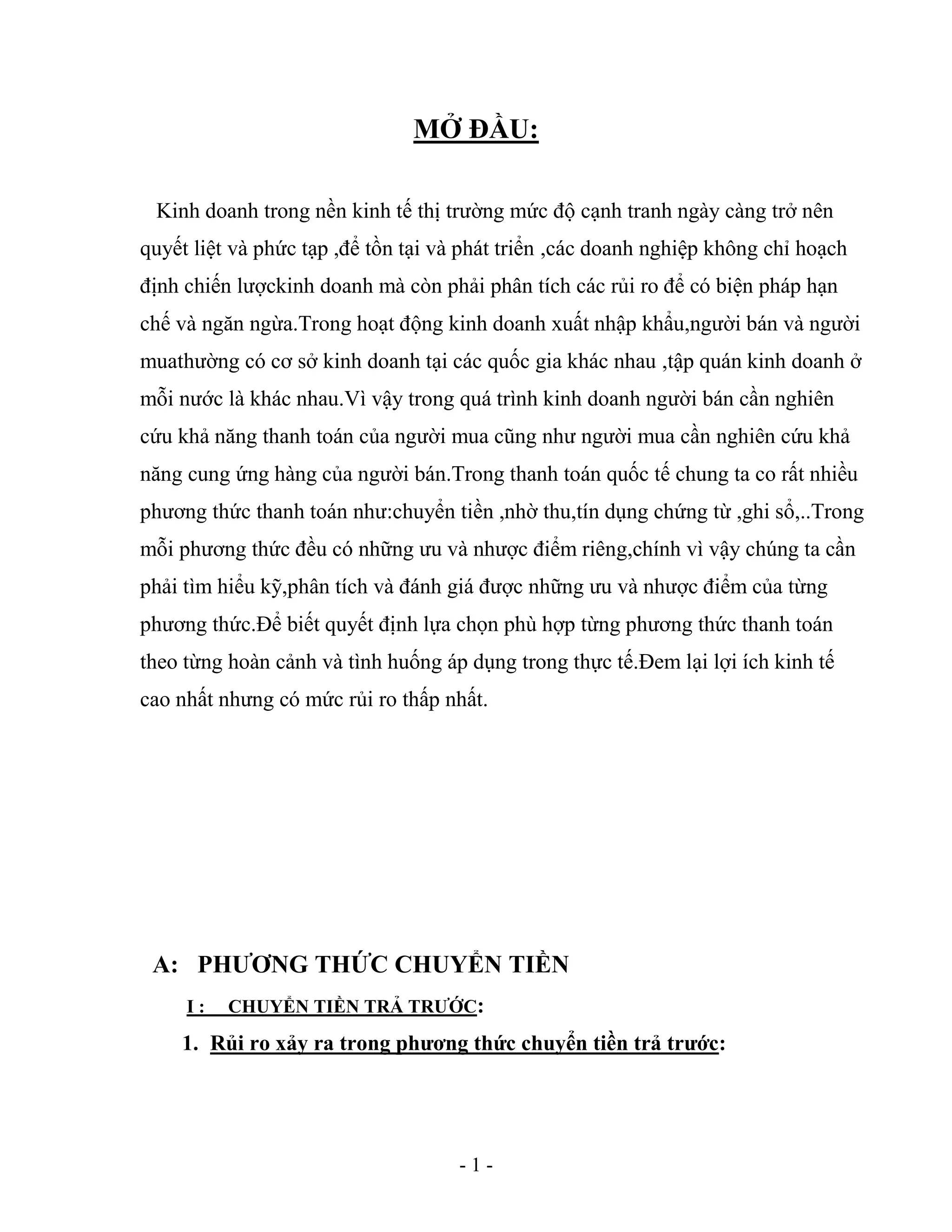 Tài liệu thảo luận về rủi ro trong thanh toán quốc tế đối với hàng xuất nhập khẩu, nhấn mạnh việc phân tích các phương thức thanh toán như chuyển tiền và nhờ thu. Ngoài ra, nó đề xuất biện pháp để hạn chế rủi ro liên quan đến mỗi phương thức, nhằm giúp doanh nghiệp tối ưu hóa lợi ích và giảm thiểu nguy cơ. Tài liệu cung cấp ví dụ cụ thể và hướng dẫn về cách áp dụng các phương thức thanh toán trong thực tế.