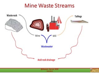 - The document discusses various types of mine waste and methods for their disposal, with a focus on tailings.