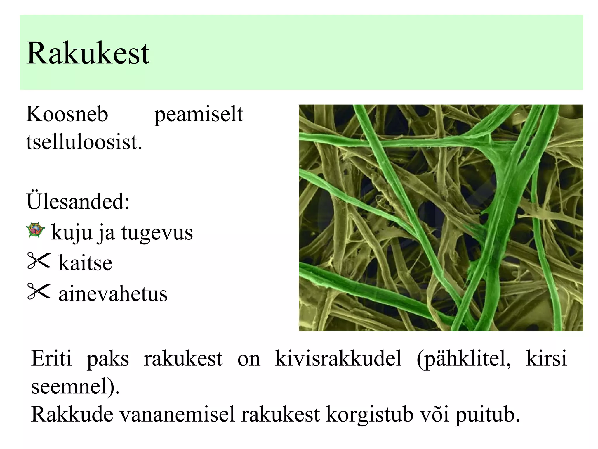 Rakukest Koosneb peamiselttselluloosist. Ülesanded: kuju ja tugevus kaitse ainevahetus Eriti paks rakukest on kivisrakkudel (pähklitel, kirsi seemnel). Rakkude vananemisel rakukest korgistub või puitub.