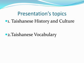 3) While related to Cantonese, Taishanese has distinct pronunciation and vocabulary. It has incorporated some English words from overseas communities but has no standardized written form.