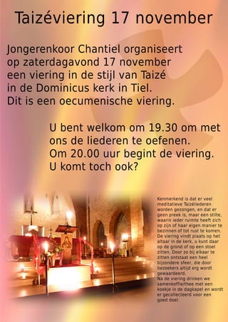 Jongerenkoor Chantiel organiseert op zaterdag 17 november vanaf 19:30 uur een viering in de stijl van Taizé in de Dominicuskerk te Tiel. Dit is een oecumenische viering.