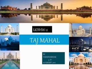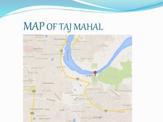 The Taj Mahal is a tomb built in the 17th century by the Mughal emperor Shah Jahan in memory of his third wife Mumtaz Mahal, who died giving birth to their 14th child. The building is located in the city of Agra, Uttar Pradesh, and is considered the finest example of Mughal architecture, blending elements of Islamic, Persian, Ottoman Turkish and Indian architectural styles.