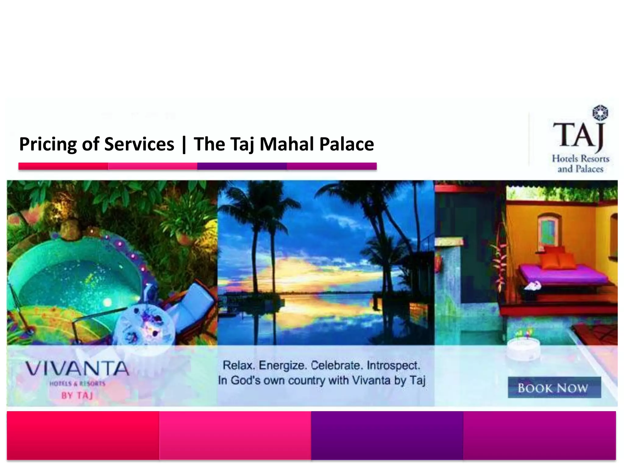 The document summarizes pricing strategies and considerations for services at the Taj Mahal Palace hotel. It discusses using a cost-based approach considering fixed and variable costs. It also discusses competition-based pricing by comparing prices to competitors like Oberoi and Leela. Finally, it discusses demand-based dynamic pricing by adjusting prices based on supply and demand factors like conventions or off-season periods. The document provides examples of pricing different room categories and the top 10 hotels in India in terms of business. It also discusses concepts like price elasticity, perceived value, and different pricing techniques.