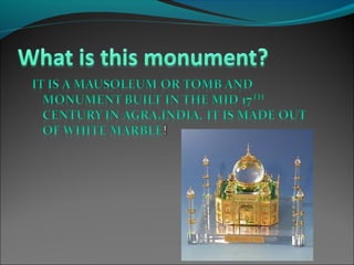 The Taj Mahal is located in Agra, India and was built between 1631 and 1648 by the Mughal emperor Shah Jahan as a mausoleum for his favorite wife. It took over 20 years to construct using 1,000 elephants and 22,000 workers and was designed to be a symbol of Shah Jahan's love for his wife. The emperor was deeply grieved by his wife's death and ordered his court to mourn for two years.