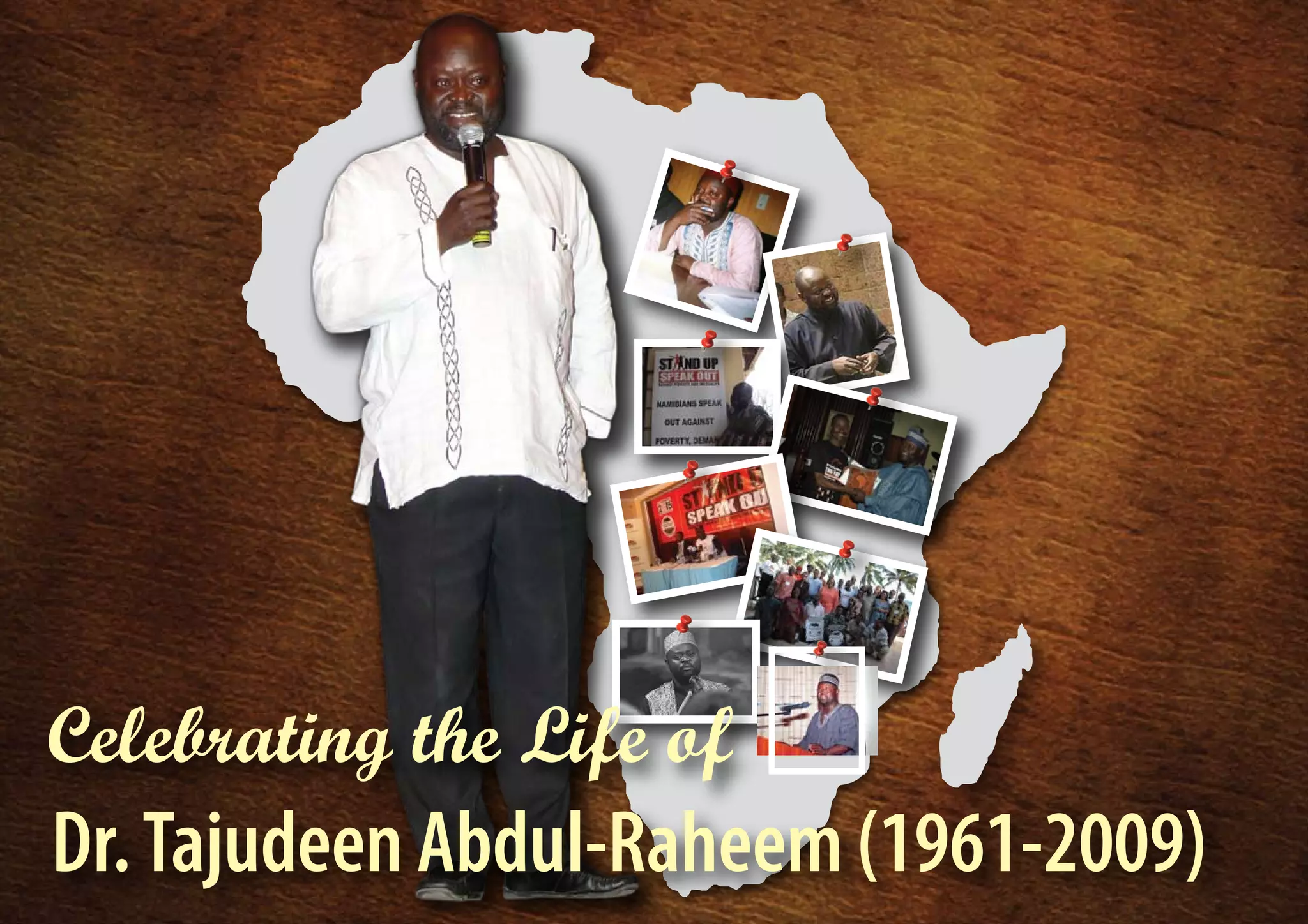 Dr. Tajudeen Abdul-Raheem (1961-2009) was a prominent African champion for social justice, renowned for his intellect, generosity, and commitment to fighting poverty and advocating for the marginalized. His death, resulting from a car accident, evoked deep grief and tributes from many who admired his work and impact on the continent, noting his dedication to the Millennium Development Goals and pan-Africanism. The document serves as a collection of reflections and memories, illustrating the lasting legacy he left behind among colleagues, friends, and admirers worldwide.