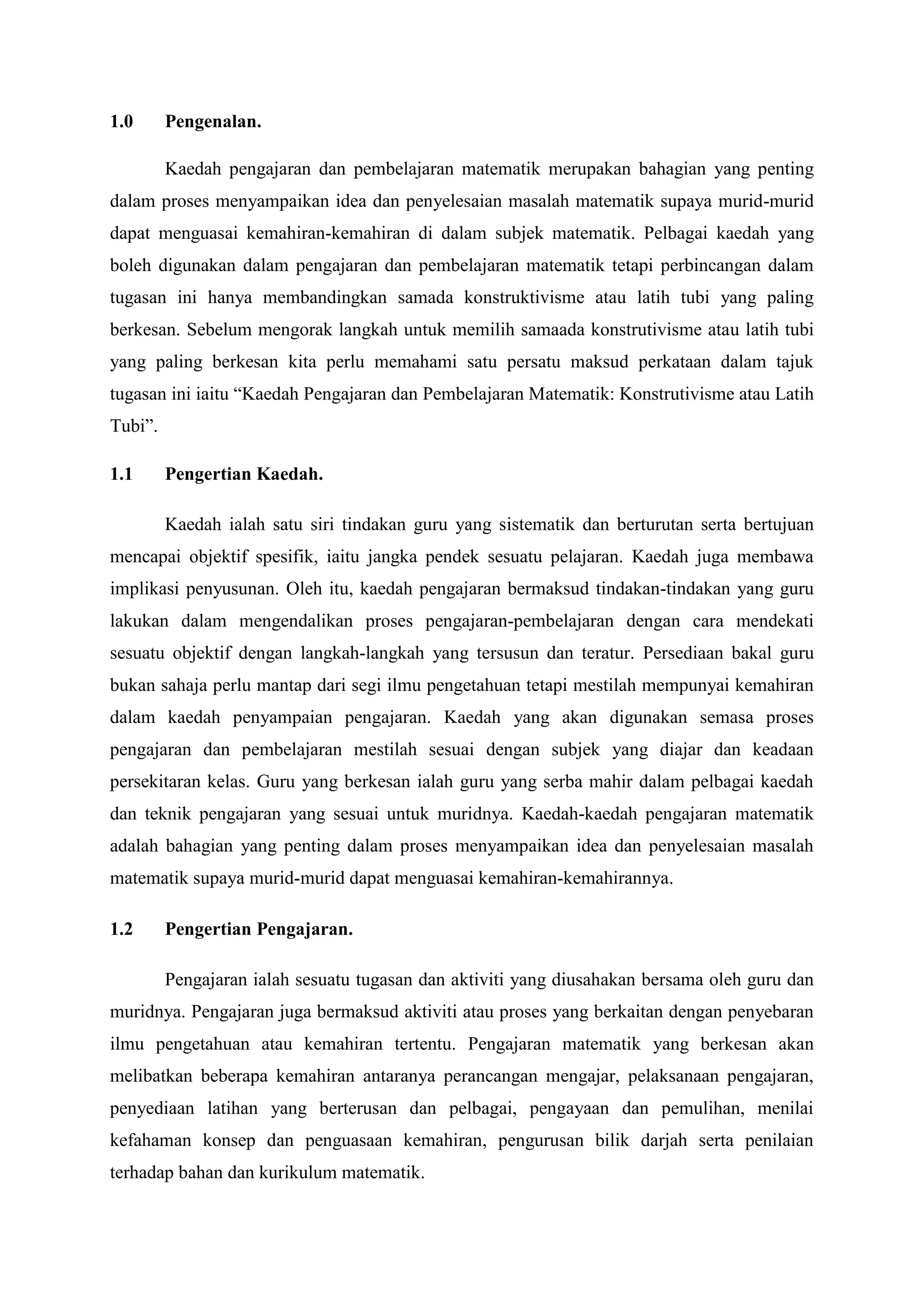 Dokumen tersebut membahasikan pemilihan kaedah pengajaran dan pembelajaran matematik antara konstruktivisme dan latih tubi. Ia menjelaskan pengertian kedua-dua kaedah tersebut serta beberapa faktor yang perlu dipertimbangkan dalam memilih kaedah seperti gaya pembelajaran pelajar dan topik pengajaran.