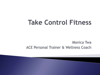Take Control Fitness offers personal training, fitness programs, nutrition coaching, and group fitness classes led by Monica Twa, an ACE-certified personal trainer and wellness coach. She provides accountability and guidance to help clients take control of their health through lifestyle choices involving activity and nutrition. Her services are aimed at helping clients spend their money on wellness rather than future illness or medications.