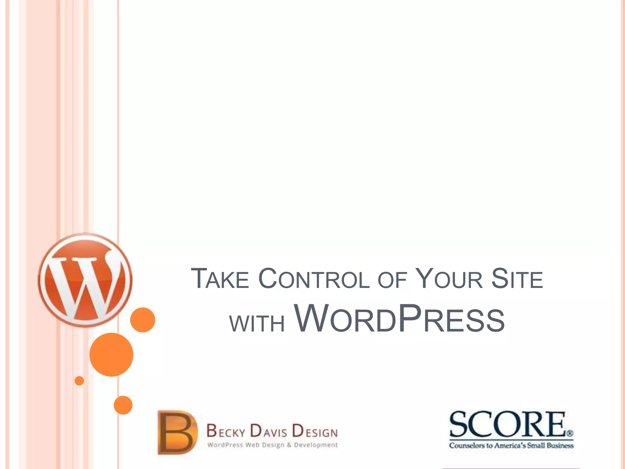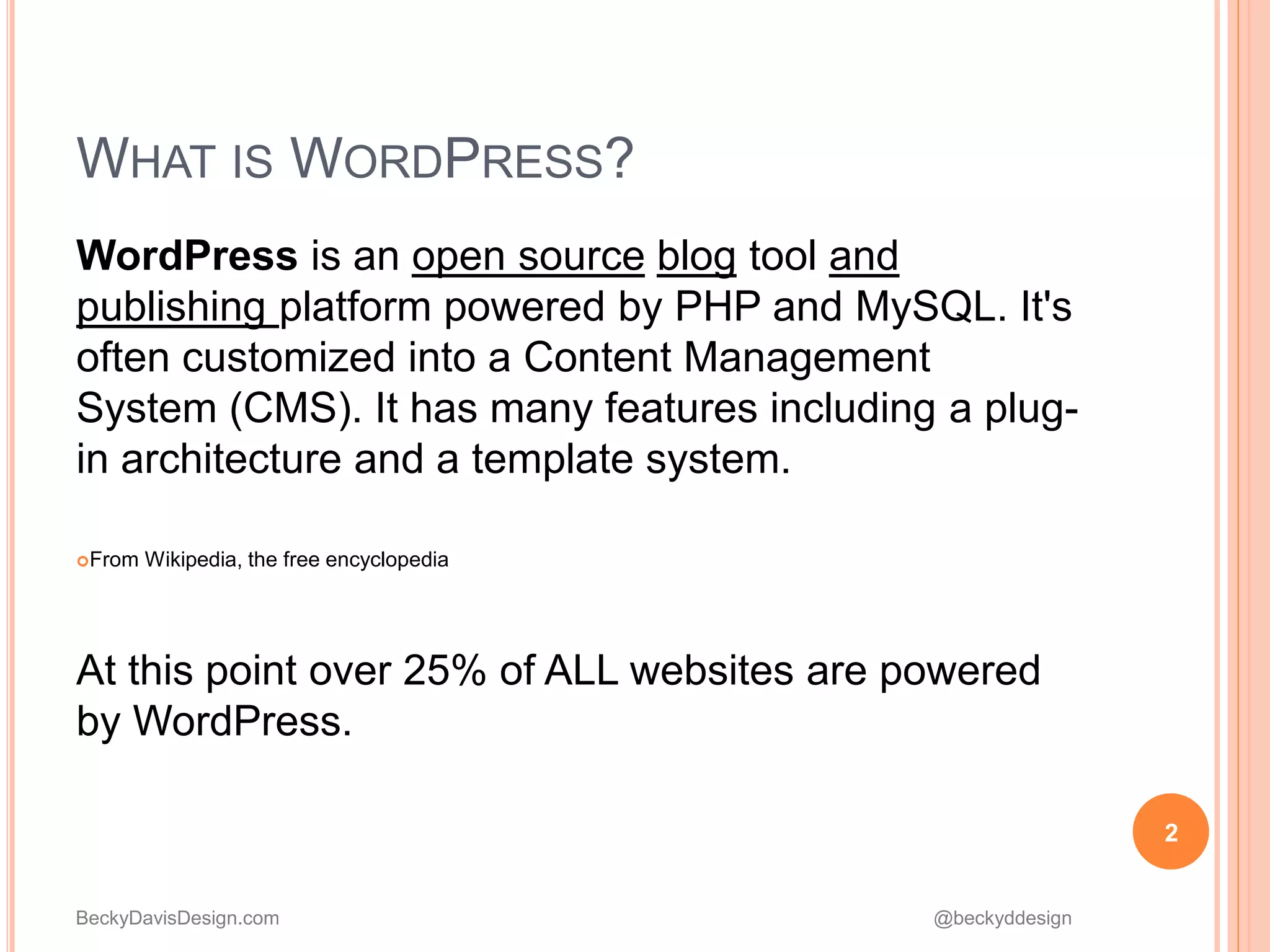 This document provides an overview of WordPress, including what it is, different versions of WordPress (WordPress.com and WordPress.org), things to be aware of when using WordPress, and basic features like posts, pages, menus, themes, plugins, and images. WordPress is an open source content management system that powers over 25% of websites and allows users to create blogs and websites without advanced coding knowledge through its user-friendly interface and features.