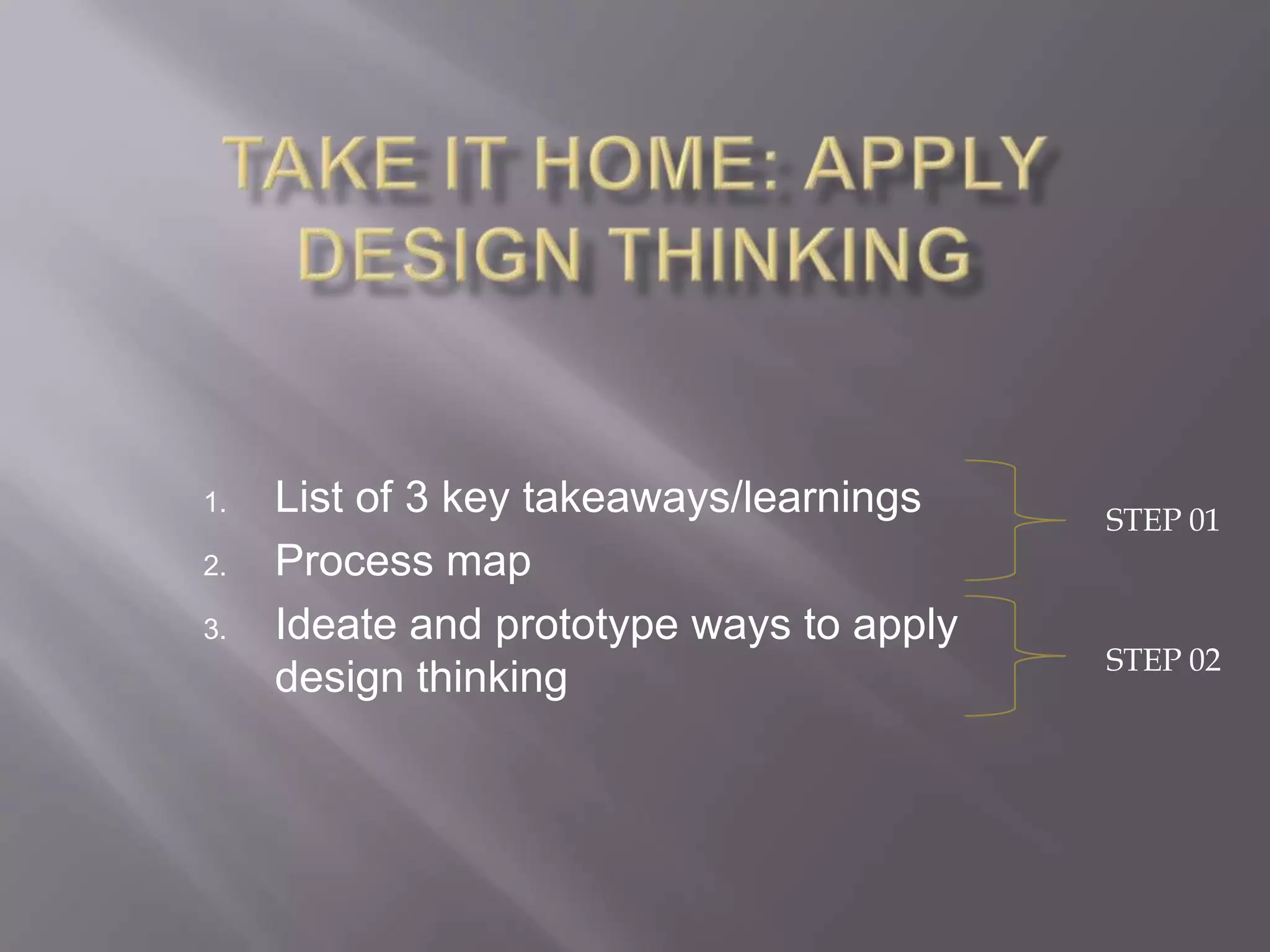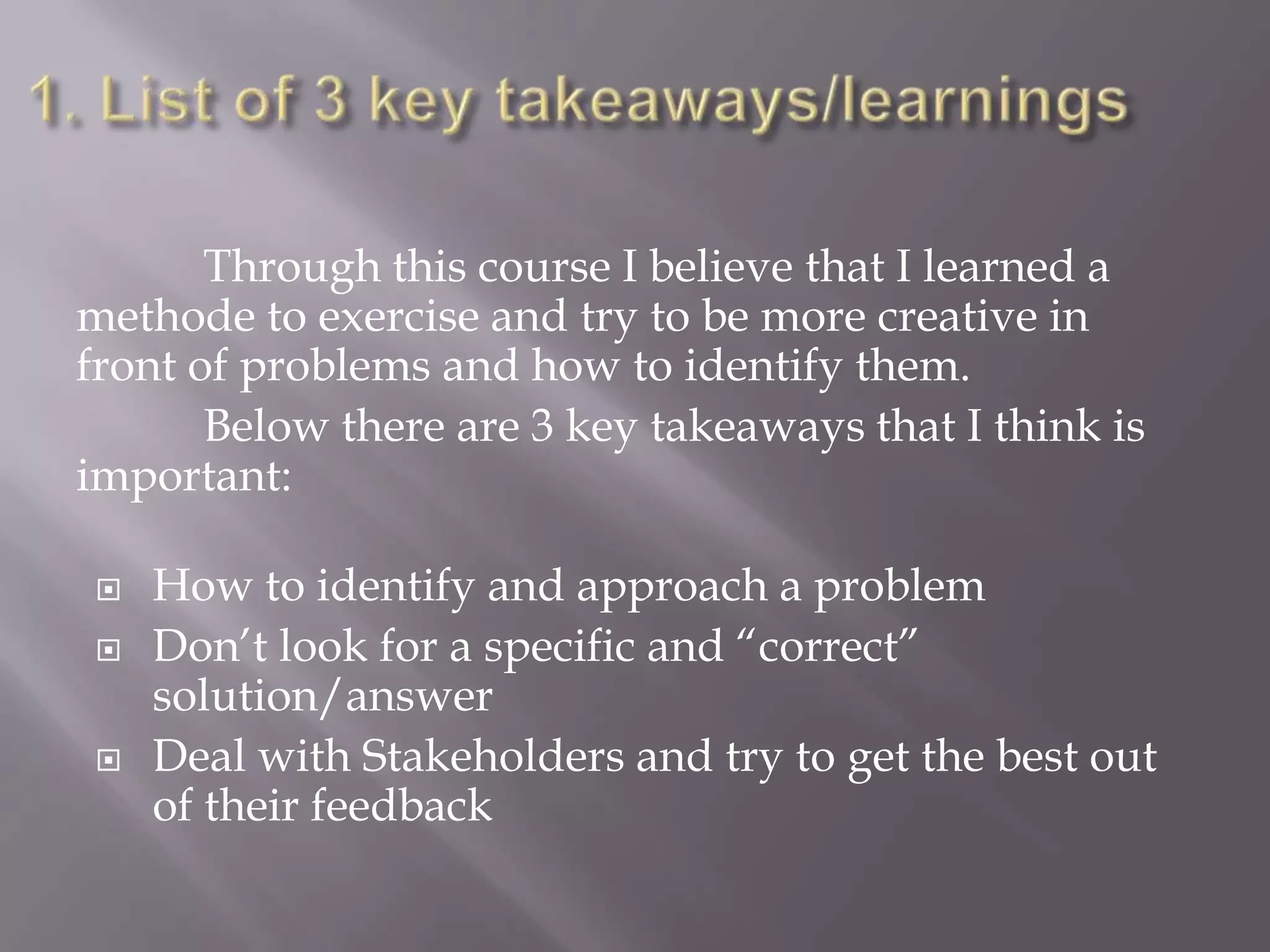 The document discusses key learnings from a design thinking course, including how to identify and approach problems, not looking for single correct solutions, and getting stakeholder feedback. It outlines the design thinking process of empathizing, defining problems, ideating 50 ideas, prototyping solutions, and testing with stakeholders. Finally, it provides examples of applying design thinking to improving a grandmother's routine and managing public transportation logistics.