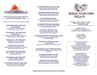 This document provides menu options and pricing for pizzas, sandwiches, salads, appetizers and sides from a pizzeria called Pi-Whole Pizzeria. It lists over 15 types of volcanic pizzas ranging in size from 8 to 16 inches and prices from $9.99 to $25.99. It also describes custom pizza, sandwiches called "Lava Bombs", pasta dishes, salads and appetizers like wings and breadsticks. Beverages including beer and wine are also available.