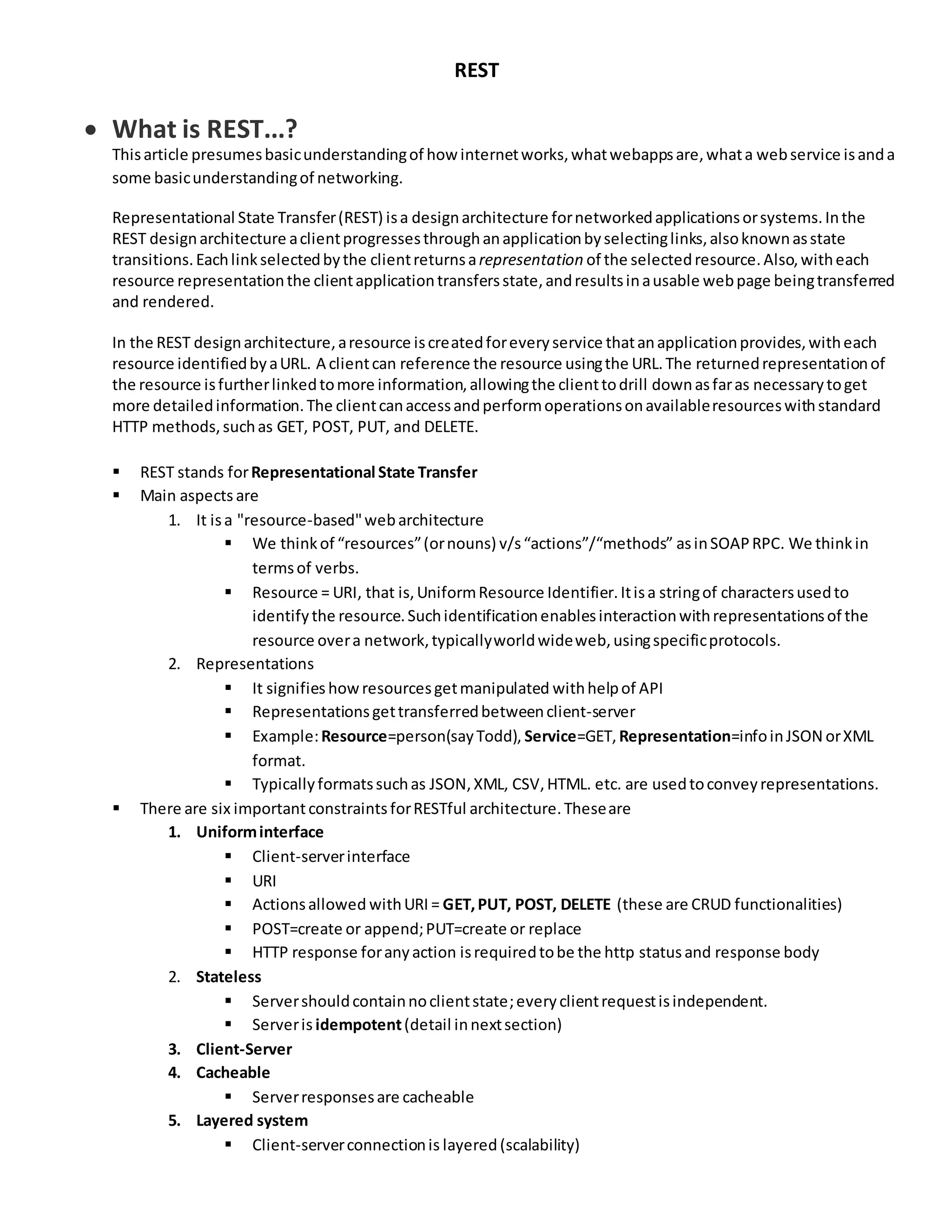 REST stands for Representational State Transfer and is a design architecture for networked applications. The key aspects of REST are that it is resource-based, with resources identified by URLs. Clients access and perform operations on resources using standard HTTP methods like GET, POST, PUT, and DELETE. Requests should be stateless and responses cacheable to allow for scalability. There are six main constraints for RESTful architecture including a uniform interface, statelessness, client-server style, cacheability, layered system, and code on demand.