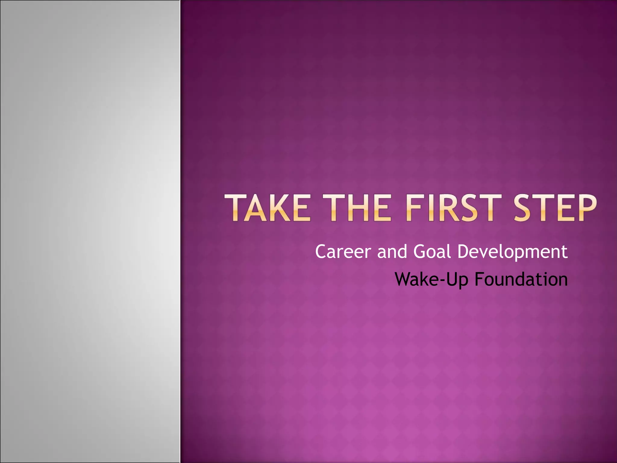 The document discusses the importance of taking the first step towards goals and outlines some key points about goal setting and achievement. It notes that success starts with the first step, which leads to future steps, and that while perfection is impossible, learning to set goals correctly can increase chances of success by helping the brain plan subsequent steps. It recommends taking action instead of waiting for guarantees, as the brain can then understand what is being done and develop follow-up steps accordingly.