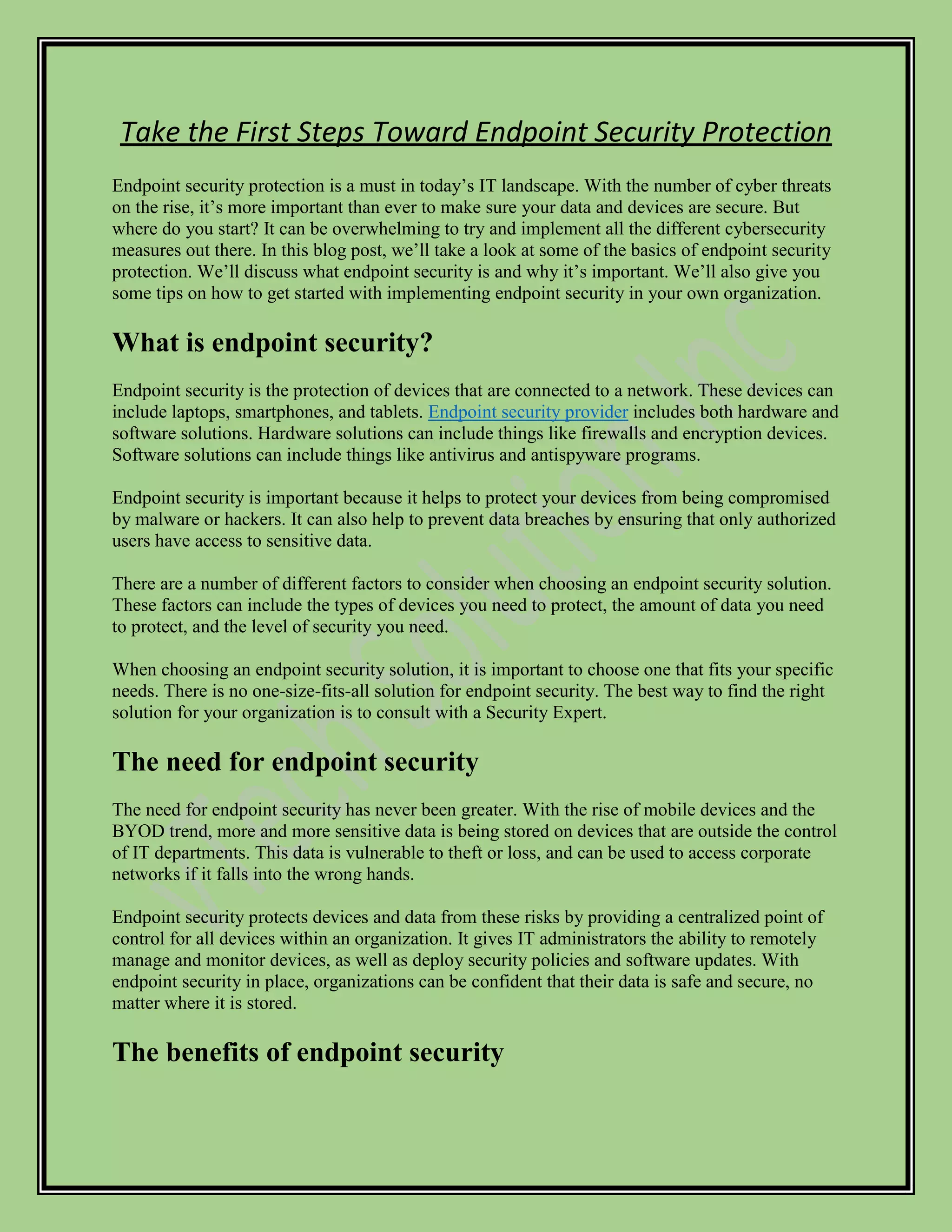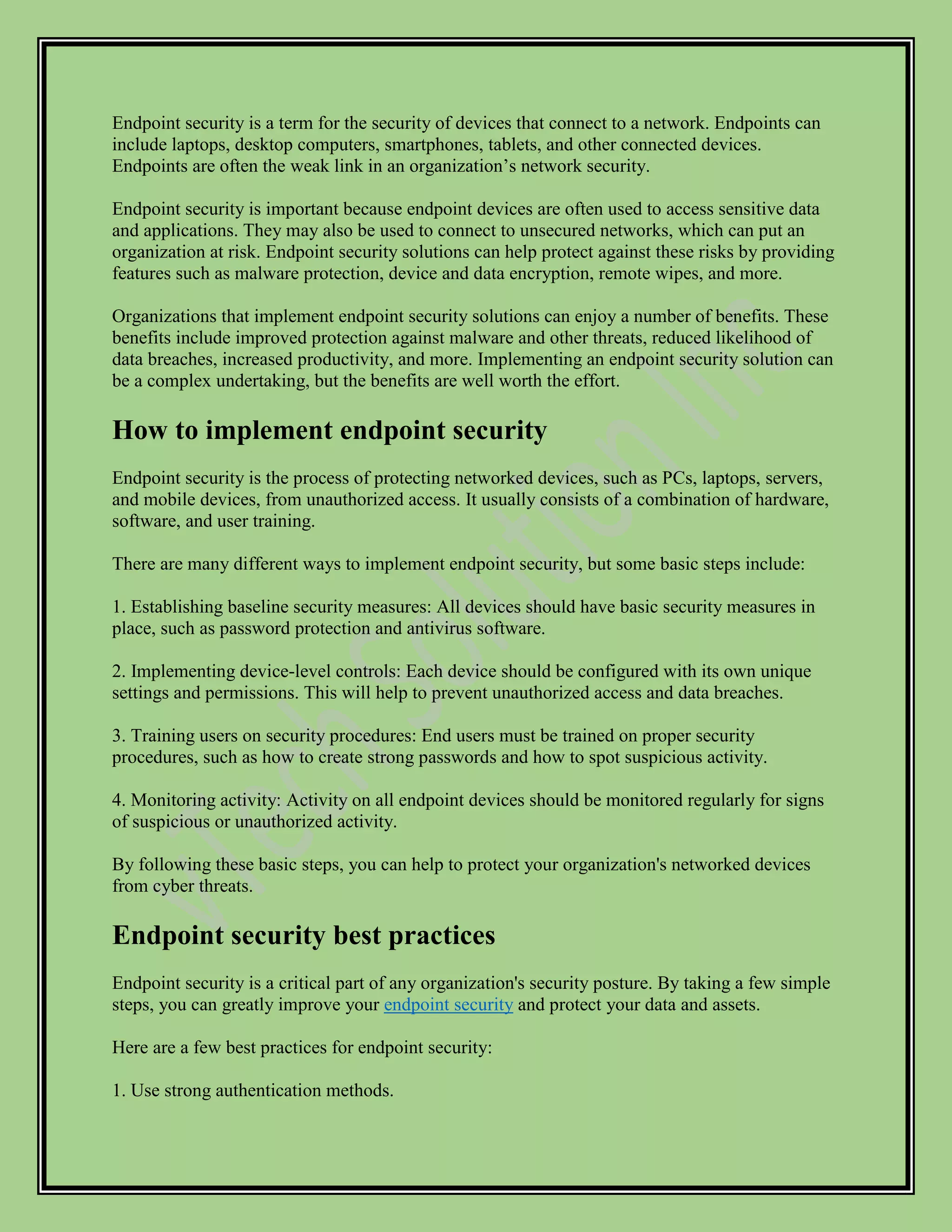 The document discusses the importance of endpoint security protection in today's IT landscape due to rising cyber threats. It outlines what endpoint security is, its necessity, benefits, and best practices for implementation, emphasizing the need for tailored security solutions based on organizational requirements. Key steps for enhancing endpoint security include establishing baseline measures, implementing device-level controls, and training users on security procedures.