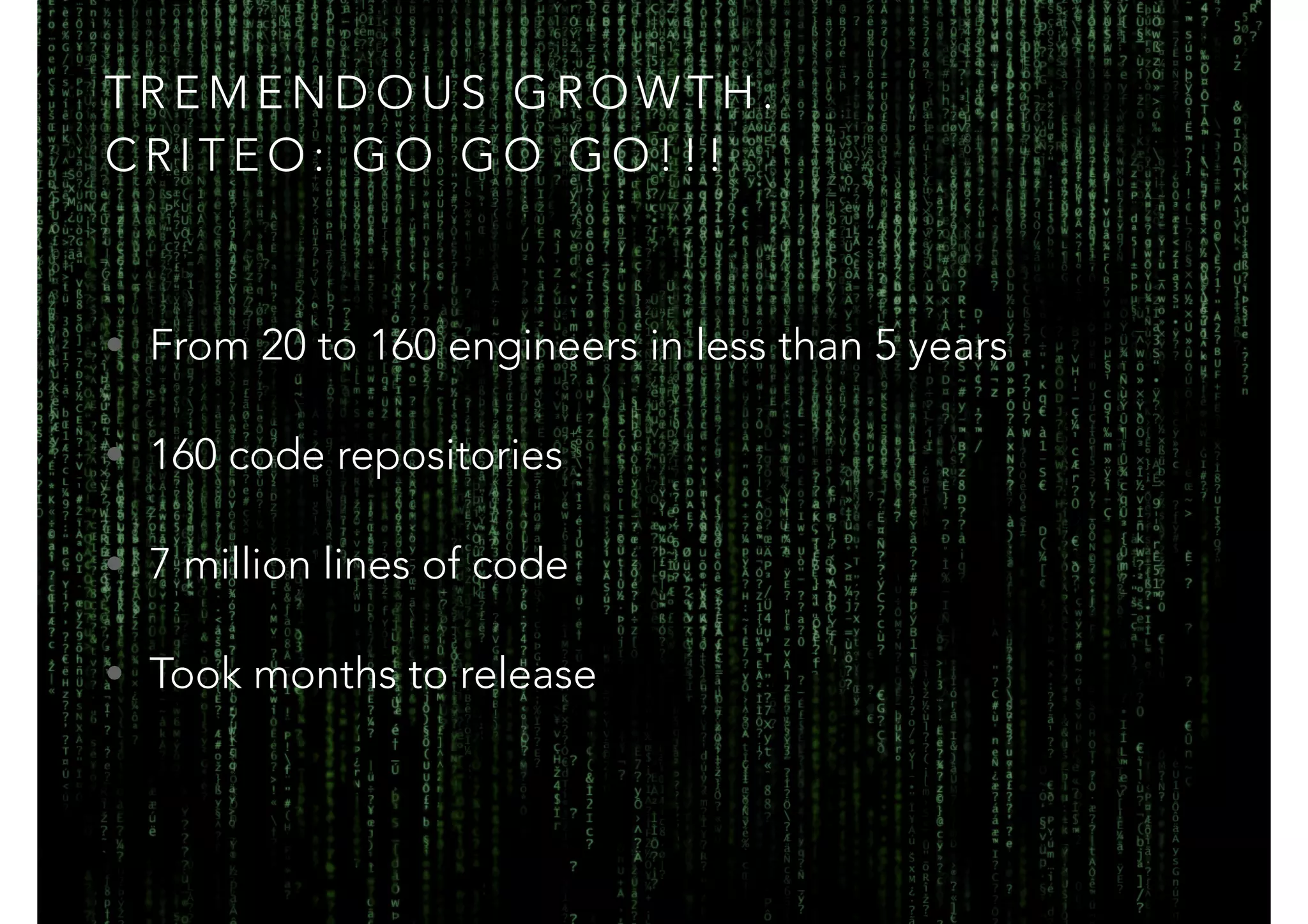 The document outlines a transformation initiative at Criteo to improve the software development process, which included increasing the engineering team from 20 to 160 engineers and creating a tailored build system and continuous integration pipeline. Key objectives were to reduce commit merge time and time from commit to production, alongside fostering a culture of shared vision and continuous improvement. The change process involved a dedicated team, strong management support, and the incorporation of Scrum methodologies to achieve significant efficiency boosts, as well as strategies for effective communication and training.