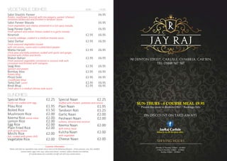 This document is a menu from an Indian restaurant. It lists various vegetarian and non-vegetarian dishes including appetizers, sides, rice, breads, and main courses. A 4-course meal is offered for £9.95 from Sunday to Thursday with 15% off takeaways. The menu provides details on ingredients and cooking methods for each dish and notes potential allergens.