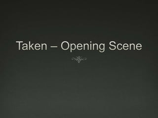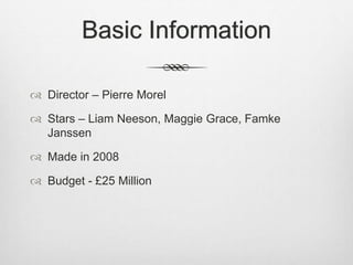 The document provides technical details about the 2008 film Taken, including the director, stars, and budget. It then analyzes the camerawork, editing, sound, and mise-en-scene of key scenes. Close-ups are used to show reactions, mid-shots depict relationships, and handheld camerawork gives a home movie feel. Slow pacing in editing and music conveys sentimentality and tiredness. Sound design and color palette differentiate the main character's dream from waking reality.