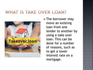 The document explains the process of taking over a loan from one lender to another, often for better interest rates and improved loan terms. It outlines the steps to find a lender, the necessary documentation, and highlights that there are no prepayment penalties or additional fees. It also discusses the option to combine debts and obtain a top-up loan, providing eligibility criteria and required documentation.