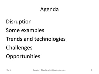 The document discusses disruption in various industries caused by new technologies. It provides examples of disruption in communication, online advertising, hotels, and journalism brought about by innovations like smartphones, Google AdWords, Airbnb, and blogs/social media. The document also examines trends driving disruption like cloud computing, mobile devices, digital payments, crowdfunding, and social networks. Finally, it outlines challenges for businesses from frequent changes and opportunities to get ahead of disruption through experimentation, agile practices, and focusing on customer needs.