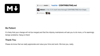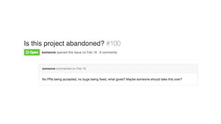 The document discusses taking over open source projects from their original creators. It emphasizes the importance of finding a competent successor to hand off a project to once interest is lost. It provides tips for taking over a project such as organizing it, creating a workflow, recruiting contributors, making releases, and always making progress to build a reputation of caring for the project and its community. The overall message is that open source projects need ongoing leadership and care even after their original creators move on.