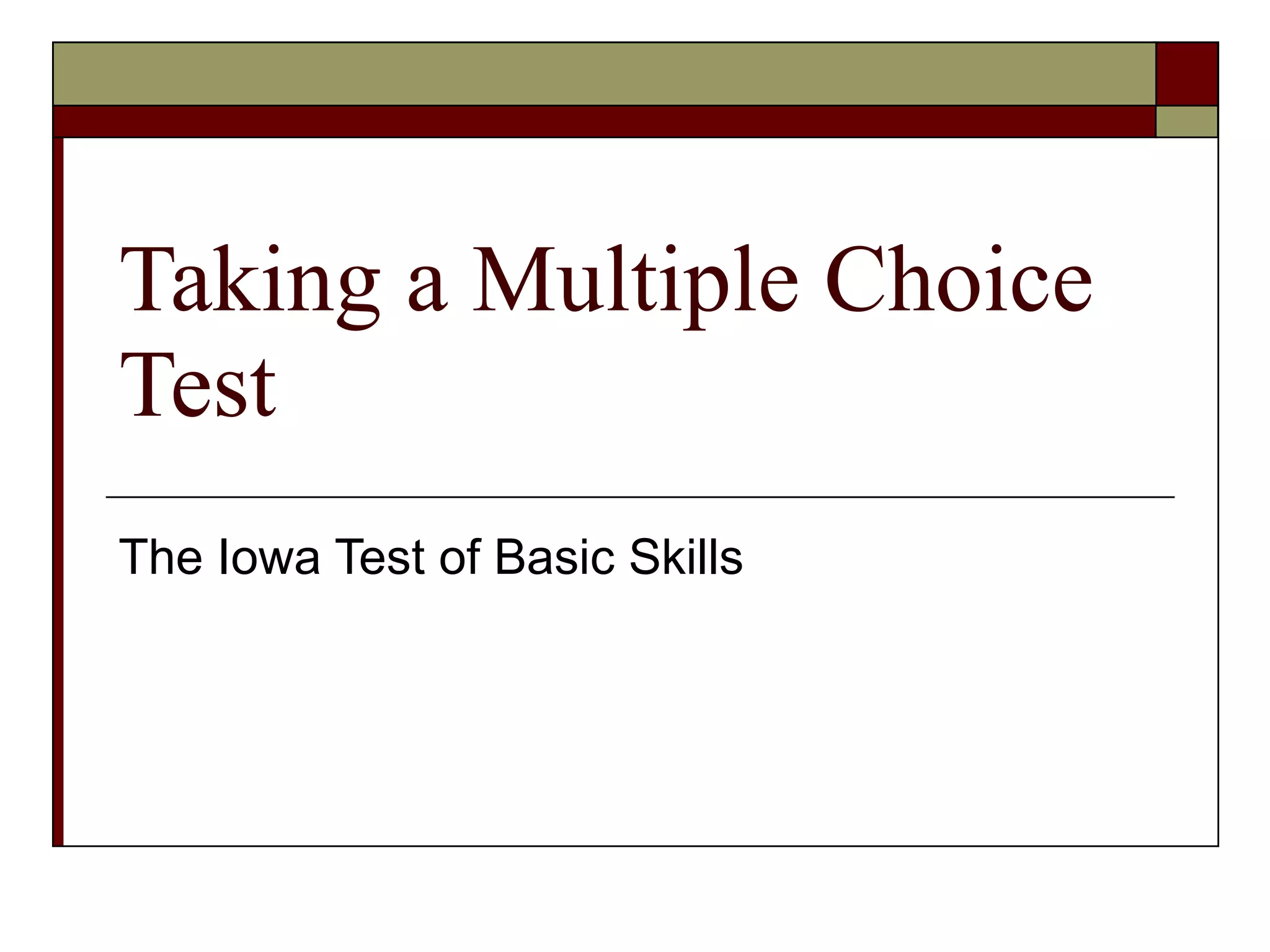 The document provides strategies for taking multiple choice tests like the Iowa Test of Basic Skills. It recommends using a two-pass system where students spend about a minute on each question on the first pass and focus on questions they were unsure of on the second pass. Students should use process of elimination to rule out obviously incorrect answers and educated guessing when they aren't completely sure of an answer. The document stresses estimating answers rather than working problems out fully to save time and suggests related techniques for math questions.