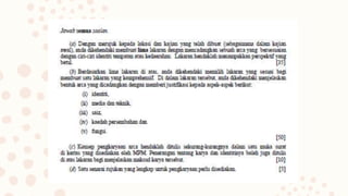 Dokumen ini menjelaskan minggu orientasi pelajar Tingkatan Enam bagi mata pelajaran Seni Visual STPM untuk sesi 2022-2023, termasuk alasan memilih Tingkatan Enam dan mata pelajaran ini. Ia menjelaskan sukatan pelajaran yang meliputi aspek teori, praktikal, dan kajian projek seni visual serta format peperiksaan yang berbeza untuk setiap penggal. Pengantar juga memberikan gambaran mengenai perubahan mata pelajaran seni visual yang menjadi lebih relevan sejak diperkenalkan.
