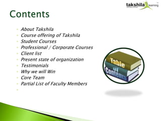 Takshila Learning is an education and training organization established in 2009 that provides courses in commerce for students, professionals, and corporations. It offers both face-to-face and virtual live courses in subjects like accountancy, finance, and business. The organization has experienced faculty and uses innovative technologies like virtual live classes. It aims to provide high-quality education and help students and professionals achieve their career goals. Takshila Learning has experienced significant growth and now has a large client base of corporate organizations.