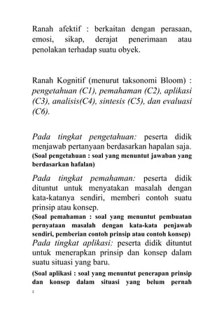 Dokumen tersebut menjelaskan taksonomi tujuan pendidikan menurut Bloom yang membagi hasil belajar menjadi tiga ranah yaitu kognitif, afektif dan psikomotor. Ranah kognitif terdiri dari enam tingkatan yaitu pengetahuan, pemahaman, penerapan, analisis, sintesis dan evaluasi."