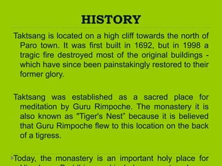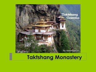 Taktsang Monastery is located on a high cliff in Paro, Bhutan. It was originally built in 1692 but was destroyed by fire in 1998 and has since been restored. The monastery is an important spiritual site because it is believed that Guru Rinpoche flew there on the back of a tigress, making it a sacred place for meditation. Monastic life at the monastery involves spiritual practices like meditation, prayer, exercise and martial arts, but recognizing that the lifestyle may not be for everyone. Buddhism helps followers pursue personal goals through discipline and following the eightfold path.