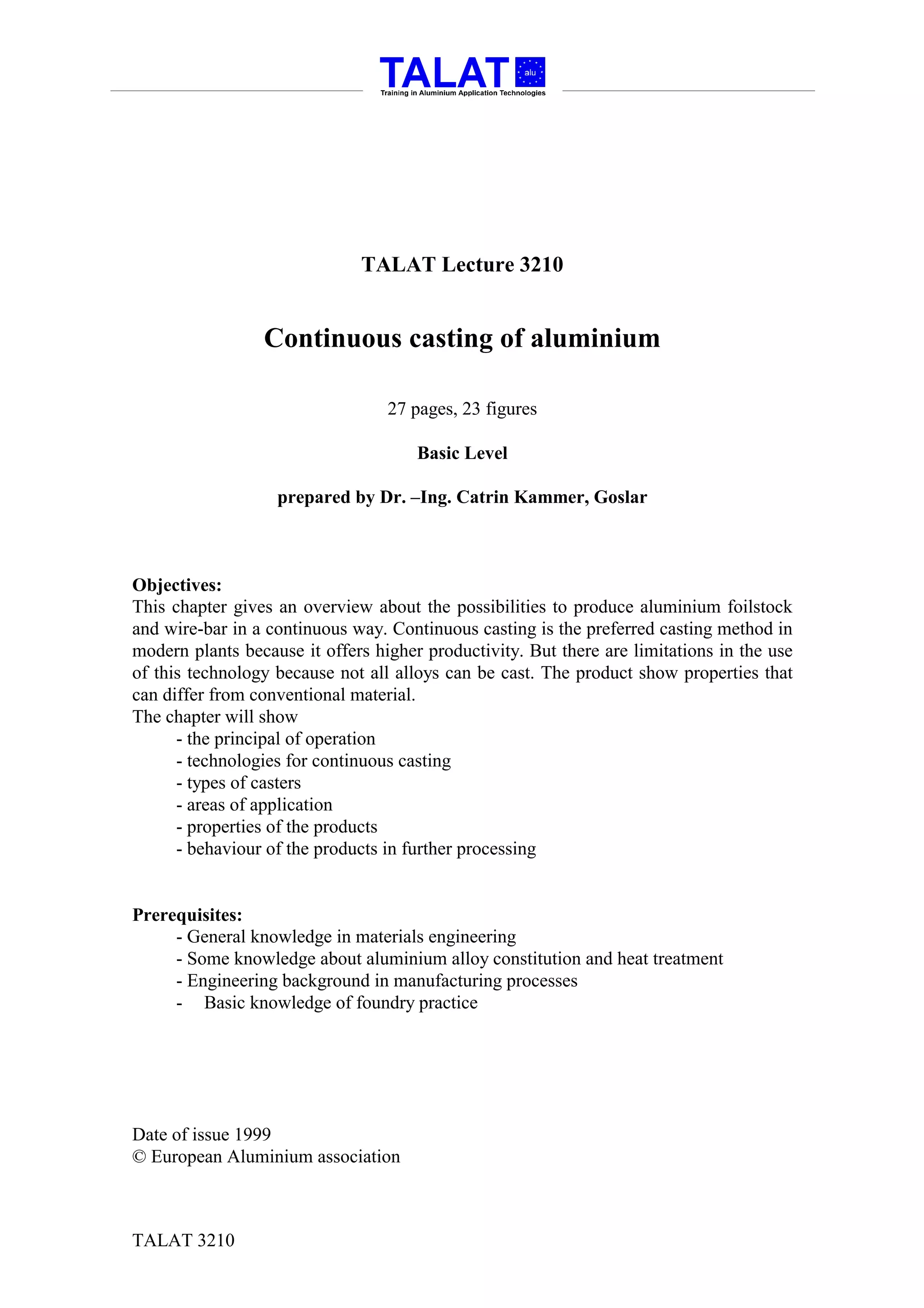 This document provides an overview of continuous casting of aluminium, specifically focusing on strip casting and wire bar casting technologies. It describes the basic principles of continuous casting, including key features like using rotating drums or belts to form a mould for molten aluminium. It discusses different types of casters like twin drum casters, single drum casters, and those using belts or blocks. It also addresses properties of continuously cast products and their behavior in further processing like rolling. The document aims to give readers an understanding of the possibilities and limitations of continuous casting aluminium.