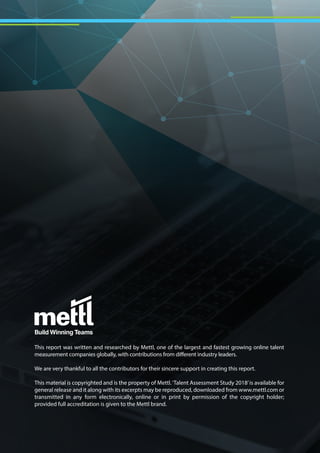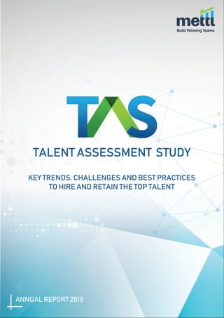 The report by Mettl highlights the challenges organizations face in talent acquisition, particularly in industries requiring highly skilled employees, and emphasizes the need for an evolved process incorporating engaging technology. Key trends show significant growth in online talent assessments, with a notable shift towards tools that enhance candidate experience and measurement accuracy while streamlining hiring processes. The document also presents data on the increased usage of various assessment methods and the importance of retaining top talent through structured learning and development programs.