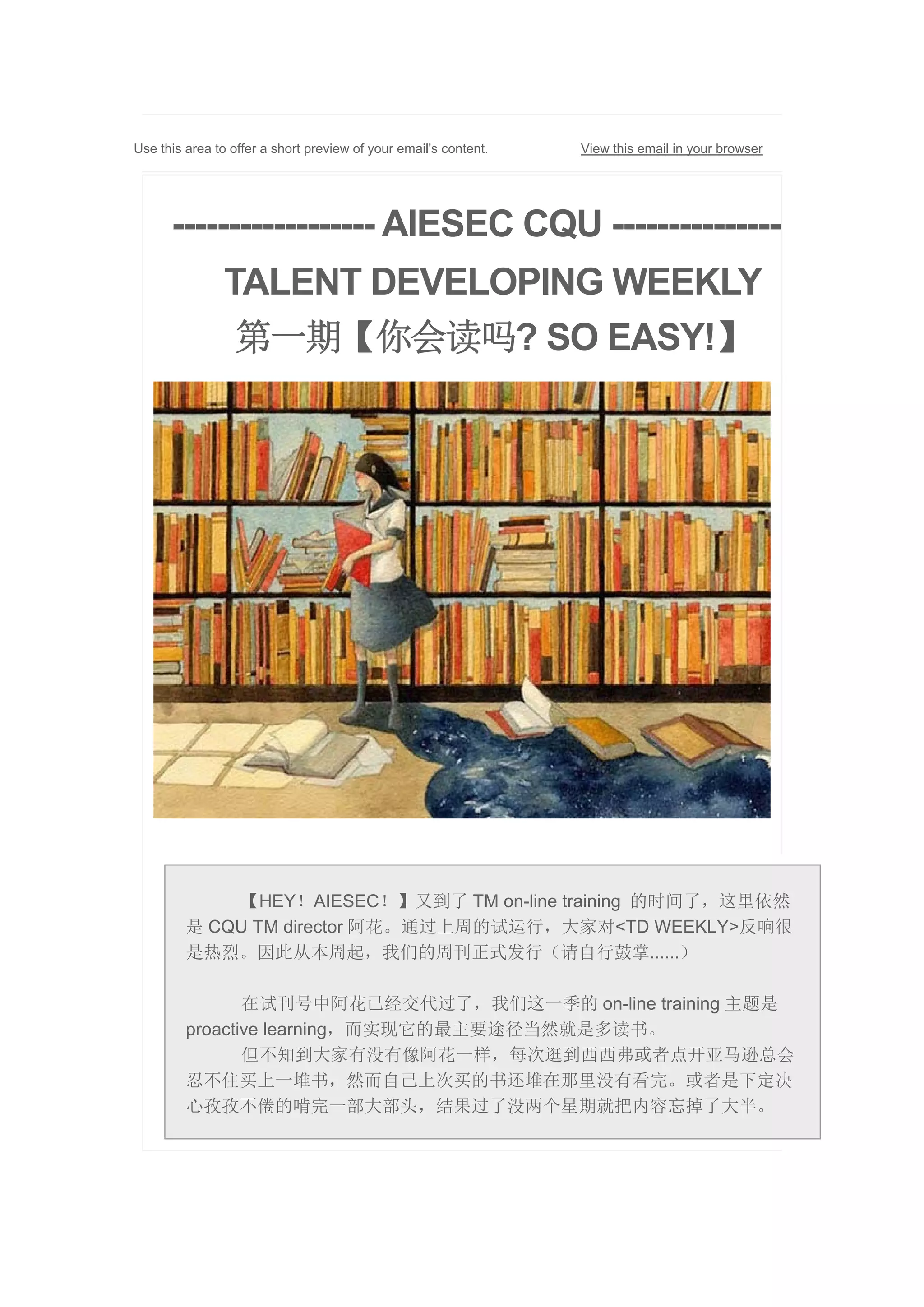 是 CQU TM director 阿花。通过上周的试运行,大家对<TD WEEKLY>反