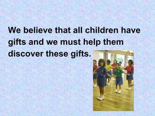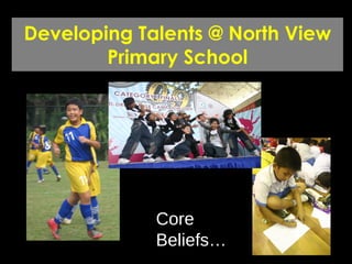 North View Primary School believes that all children have gifts and talents that can be nurtured. The school provides a structured approach to help pupils discover and develop their talents through academic and non-academic programs. Talents are identified through lessons and modules, and pupils are directed to cocurricular activities for further development. The school aims to provide opportunities for pupils to achieve, excel, and gain confidence in their talents.