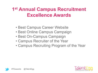 The document summarizes the winners of the 1st Annual Campus Recruitment Excellence Awards in several categories: Best Campus Career Website (PwC Canada), Best Online Campus Campaign (MacLaren McCann for MasterCard Canada), Best On-Campus Campaign (ConocoPhillips Canada), Campus Recruiter of the Year (Lisa Kramer from Accenture), and Campus Recruiting Program of the Year (KPMG LLP's Ace The Case program). The document provides details on the winning campaigns and programs and what the judging panels liked about each.