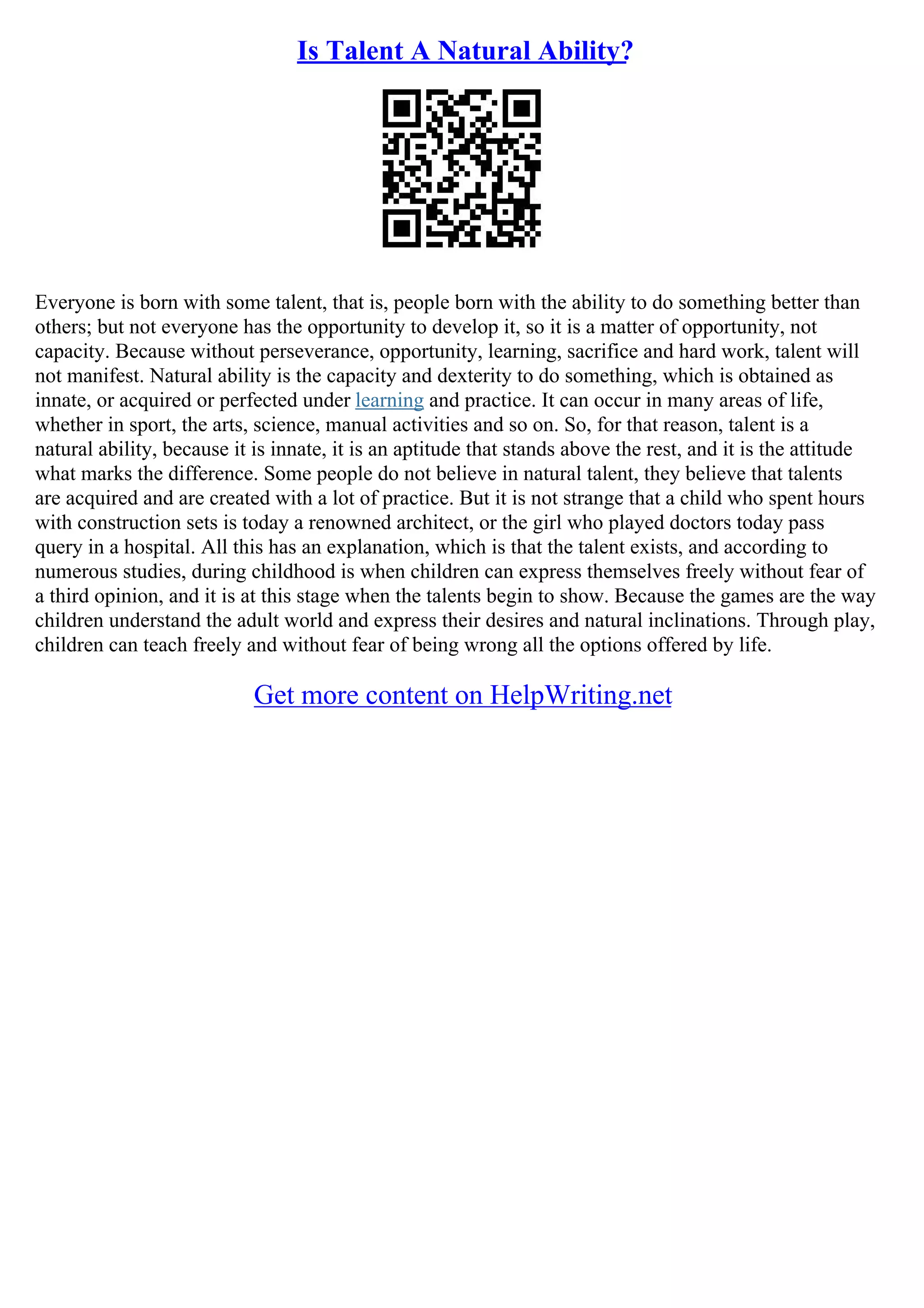 The document discusses the nature of talent, emphasizing that while everyone has innate abilities, success requires opportunities and hard work to develop those talents. It explores various perspectives on talent, suggesting that creativity and adaptability are significant attributes. Additionally, it examines the importance of talent management in organizations, highlighting its role in employee development and retention.