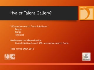 Talent Gallery tilbyr headhunting, management for hire og forretningsutvikling. Vi bistår i internasjonal rekruttering gjennom et nettverk på mer enn 500 search selskap i alle verdensdeler. Kontakt Trond Larsen, telefon 9130 2220 for mer informasjon.