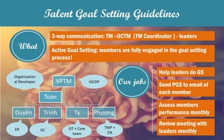 This document provides guidelines for setting goals within a talent management team. It outlines that goals should be SMART (specific, measurable, achievable, relevant, and time-bound). It emphasizes engaging team members in the goal setting process and ensuring goals are personalized. A sample is given showing goals for individual team members with assigned tasks and criteria for measuring achievement. The importance of ongoing communication and recognition is stressed to motivate team members and work towards achieving the shared team vision.