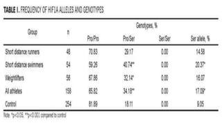 This document discusses how genetic testing and DNA profiling can be used to individualize training programs and nutrition for athletes to optimize performance. It describes several genes associated with endurance ability, muscle performance, power/sprint performance, and how variations in these genes like ACTN3, ACE, NOS3, and PPARA impact athletic traits. The document also discusses using genetic testing for early talent identification and how knowledge of an athlete's genetic profile can guide their specialized training and help achieve their potential.