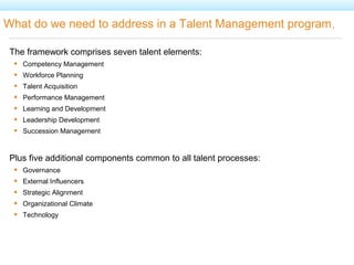 The document outlines the key components of an effective talent management program, including competency management, workforce planning, talent acquisition, performance management, learning and development, leadership development, and succession management. It also lists additional common components like governance, external influencers, strategic alignment, organizational climate, and technology. The document emphasizes that talent programs must start with a positive company culture aligned with goals, and include globally aligned systems and processes to support recruitment, career development, training, and reward/retention of top talent. Initial steps include developing a talent strategy, identifying supporting systems, engaging leadership, and addressing fundamental gaps.
