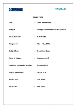 This document is a student assignment on the topic of talent management. It includes an introduction to talent management, the need for talent management, challenges in talent management, the role of HR, and examples of talent management practices at Accenture and Infosys. The conclusion discusses future trends in integrated talent management.