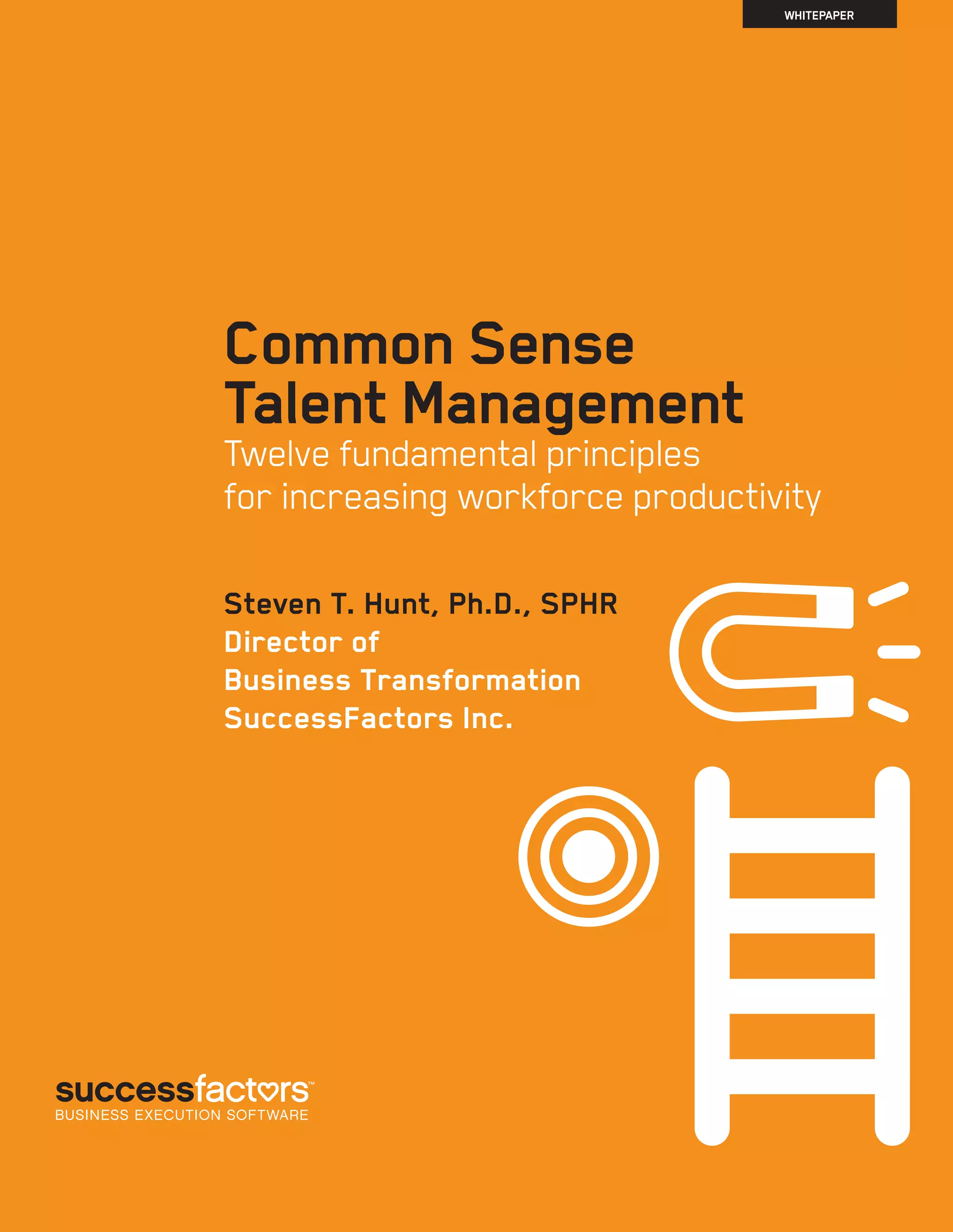 This whitepaper discusses 12 fundamental principles for effective talent management based on scientific research on employee behavior. The four core principles, referred to as ROAD, are respecting employees, clarifying objectives, increasing awareness, and creating dialogue. Respect involves recognizing employees and their goals. Clarifying objectives means clearly defining job goals. Increasing awareness is providing feedback to help employees learn. Creating dialogue is open communication. The other eight principles relate to accountability, development, performance standards, visibility, career growth support, potential evaluation, goals, and strategic engagement. Understanding these principles can improve talent management programs and better influence employee behavior.