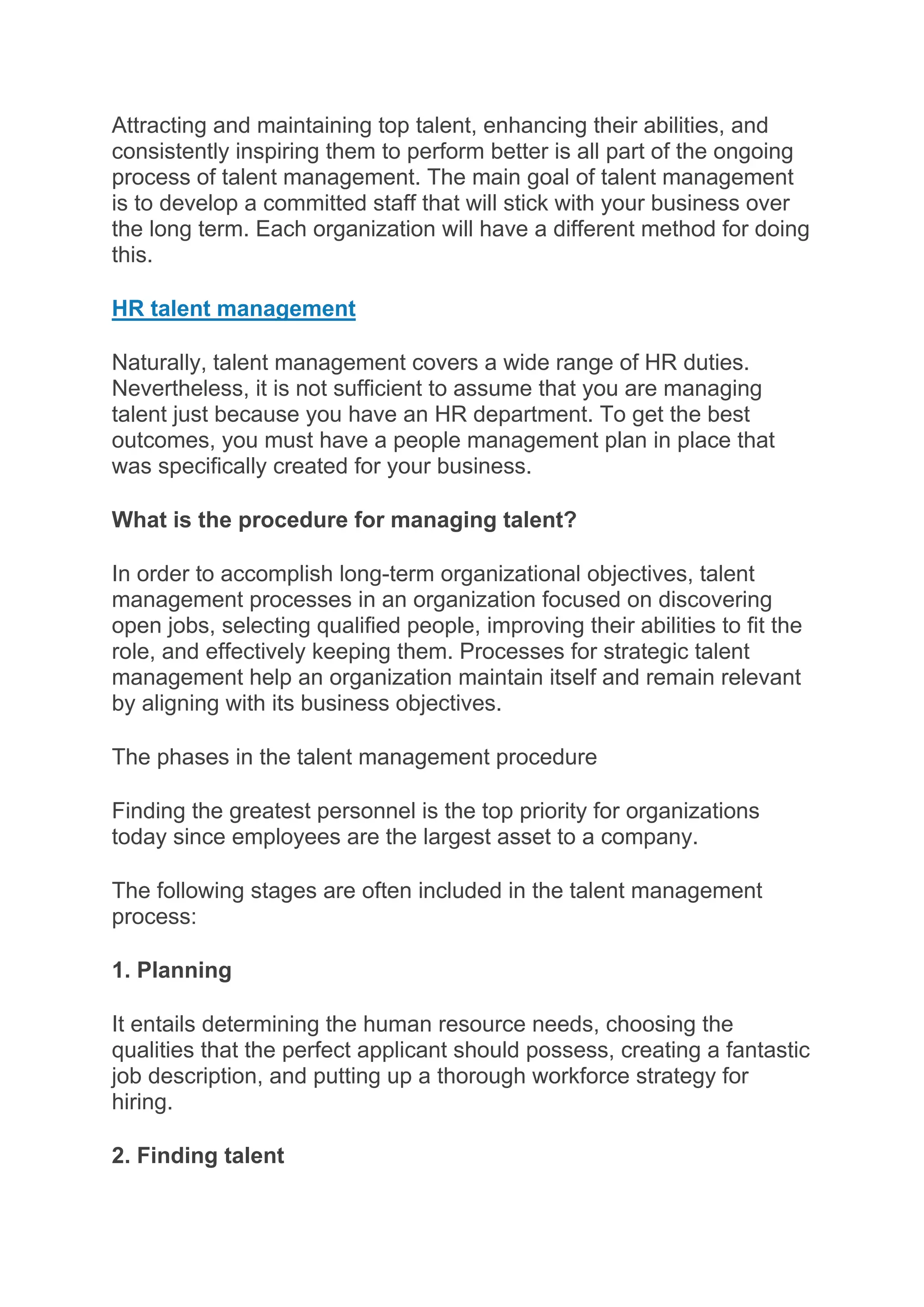 The talent management process is essential for enhancing employee performance through recruitment, retention, rewards, and development, impacting engagement and turnover. It involves strategic planning, hiring, training, and retention strategies tailored to organizational needs, ensuring that skilled employees stay aligned with business goals. Effective talent management leads to improved productivity, employee satisfaction, and maintaining a competitive edge in the market.
