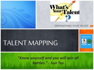 Dokumen tersebut membahas tentang talent mapping dan tes kepribadian MBTI. Talent mapping digunakan untuk mengidentifikasi bakat, minat, dan kemampuan seseorang, sementara tes MBTI menghasilkan 16 tipe kepribadian berdasarkan empat dimensi: introversion-ekstroveesi, sensing-intuisi, thinking-feeling, judging-perceiving.