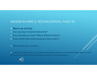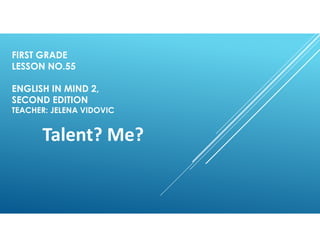 This document is a lesson plan for a first grade English class. It includes vocabulary words, exercises about a reading passage, and questions to predict what will happen in an episode of a video related to the reading. The reading is about a boy named Joel who thinks he doesn't have talents, but others admire his singing ability. Students are asked to do vocabulary, true/false, matching, and dialogue exercises about the reading. They are also asked to predict how different characters would give a class presentation and who might get nervous or stay calm.