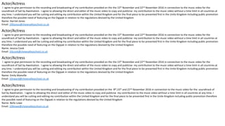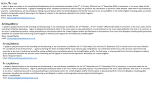 The document contains permission forms from several actors/actresses agreeing to have their contributions to a music video for the song "Sail" by Awolnation recorded, broadcasted, edited, and publicized without limitations. They consent to having their content used in the music video that will be first presented in the United Kingdom and may appear on the album packaging/Digipak. The contributions were provided on various dates in October and November 2016.