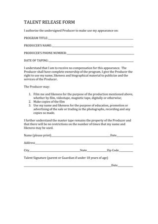 This talent release form authorizes a producer to film an individual and use their likeness and name for a specified program without compensation. It gives the producer full ownership of the recording and allows unlimited use of the individual's image and name to publicize and promote the producer's services. The individual agrees the producer can film, copy, and distribute the recording for education, promotion or advertising purposes.