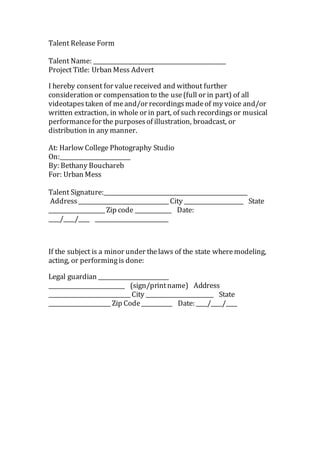 This talent release form allows Urban Mess to use video, audio, and images taken of the talent at Harlow College Photography Studio on a specified date by Bethany Bouchareb. The talent consents to the use of recordings and performances for broadcast, distribution, or illustration purposes related to the Urban Mess project. If the talent is a minor, a legal guardian must also sign to consent.