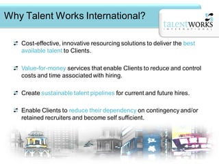 Talent Works International provides cost-effective and innovative resourcing solutions through talent pooling, recruitment research, and market intelligence. They create talent pipelines for clients to reduce costs and time associated with hiring. Talent Works maps competitors to gain market insights and identifies potential candidates. Their solutions include maintaining talent pools of passive candidates and identifying targets from competitors to approach about current and future opportunities. Clients include large multinational companies across various industries.