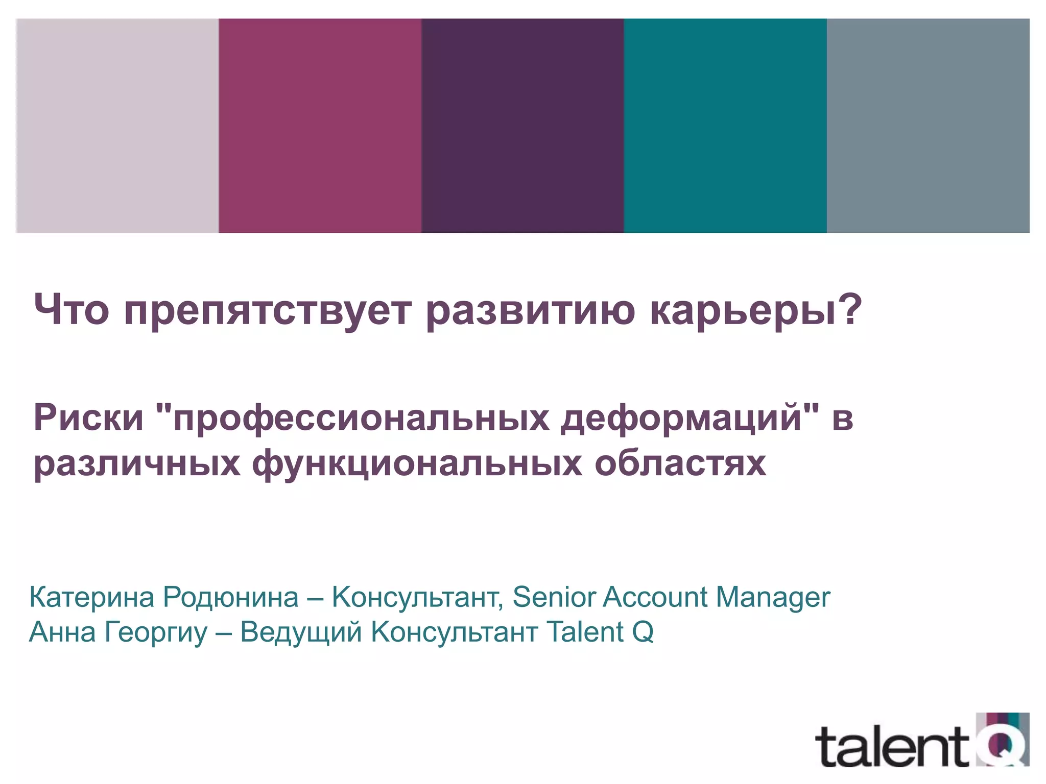 Документ обсуждает факторы, препятствующие карьерному росту, выделяя восемь профессиональных деформирующих факторов, связанных с личностью, которые могут иметь негативное влияние на карьеру. При этом рассматриваются характеристики таких деформаторов, а также их связь с профессиональными ролями и навыками. Упоминаются инструменты Talent Q, предлагающие оценку и развитие персонала, а также роль HR в минимизации влияния негативных факторов.